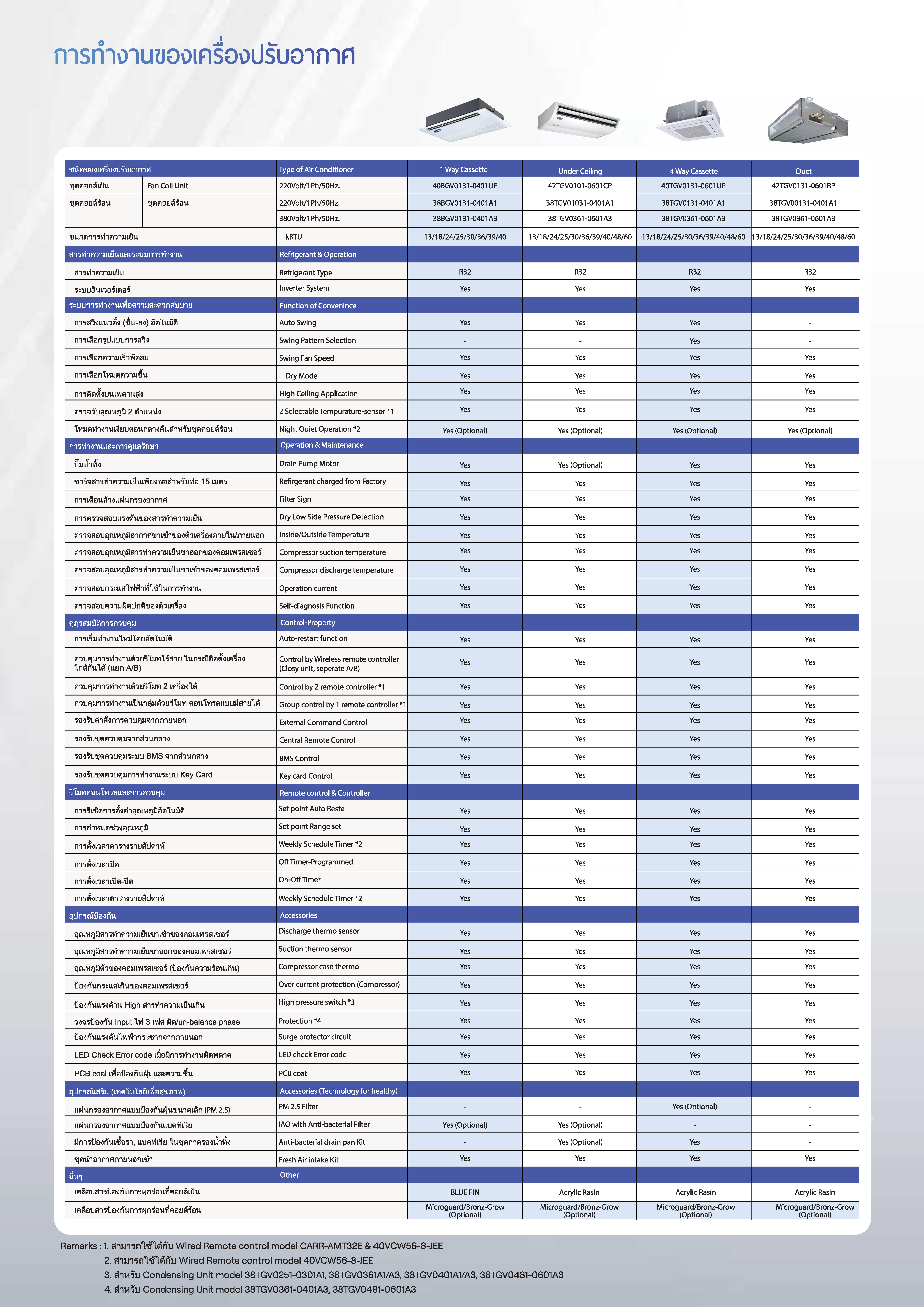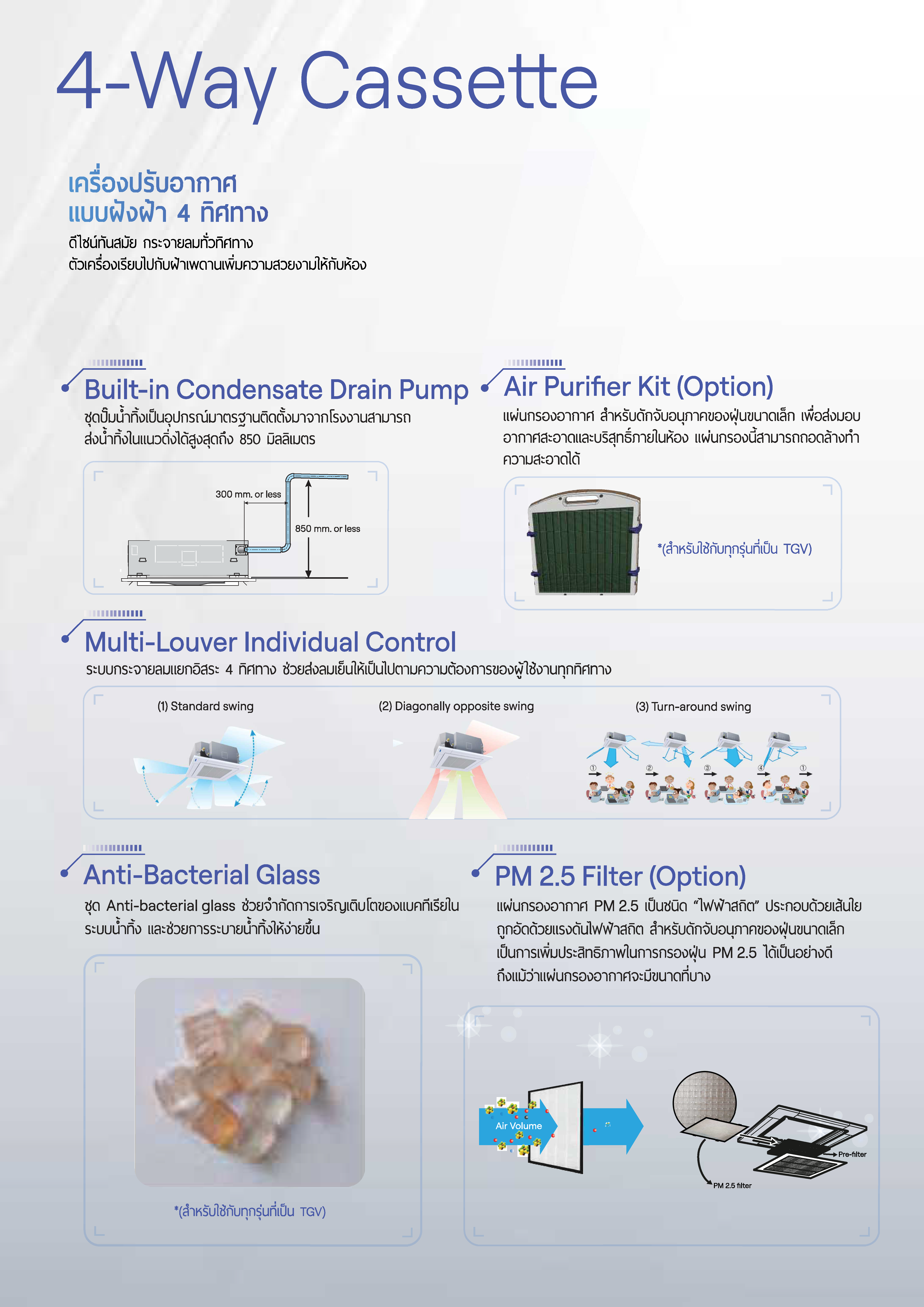 Carrier TGV Series มาพร้อมเทคโนโลยีอินเวอร์เตอร์เต็มระบบ ประหยัดพลังงานสูงสุดด้วยค่า SEER สูงถึง 22.70 ให้ลมเย็นทั่วถึงทั้ง 4 ทิศ มาพร้อม Built-in Drain Pump เคลือบสาร Aqua Resin ล้างทำความสะอาดตัวเองได้ และสามารถใช้งานได้แม้ในอุณหภูมิภายนอกสูงถึง 46°C