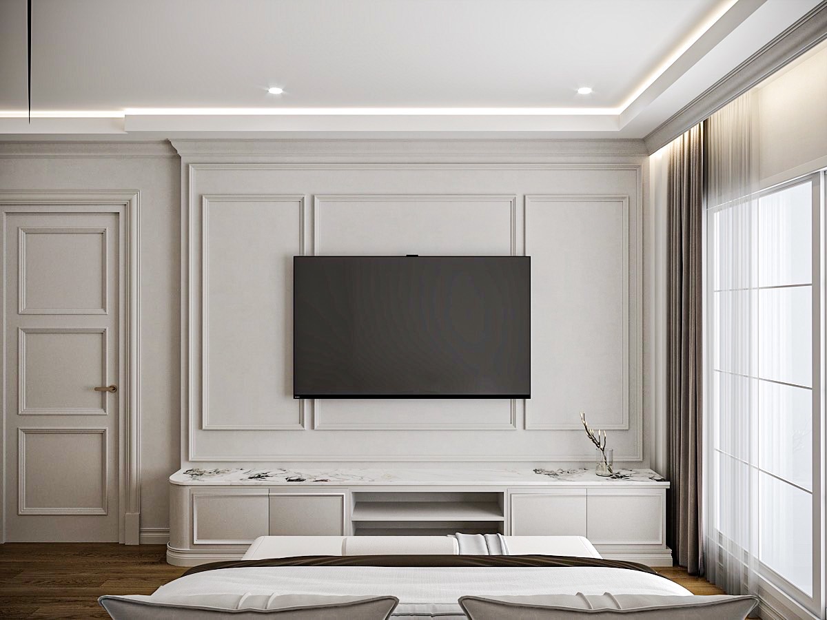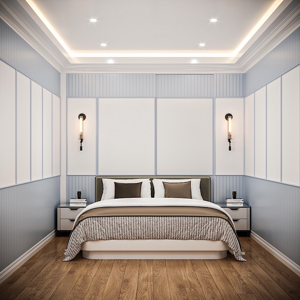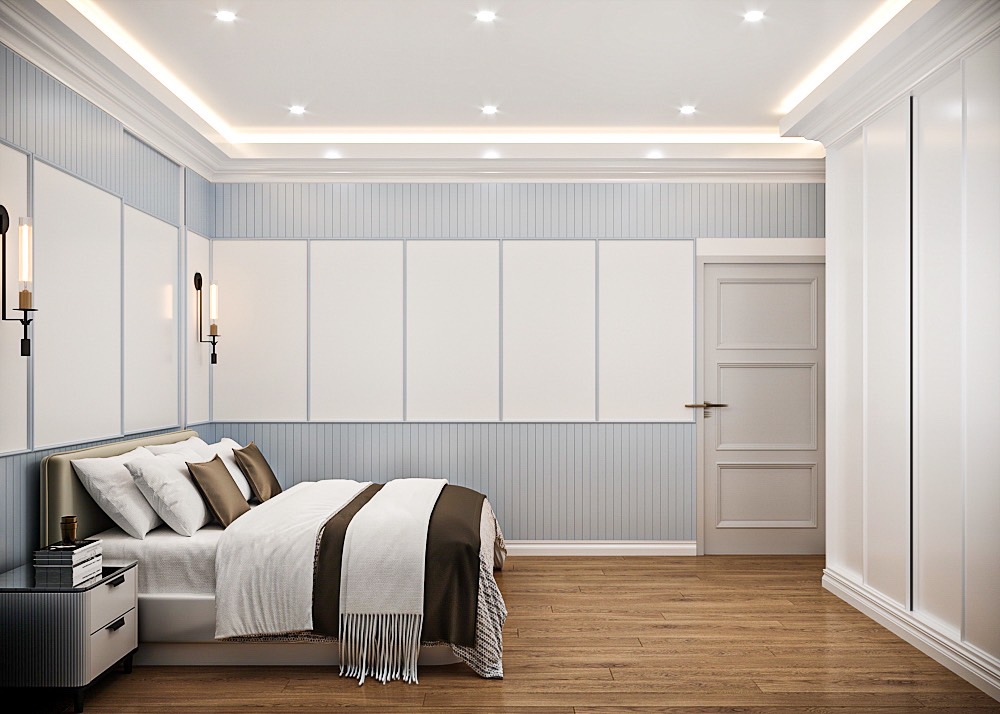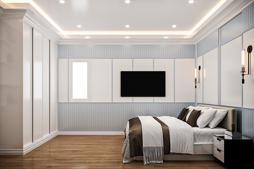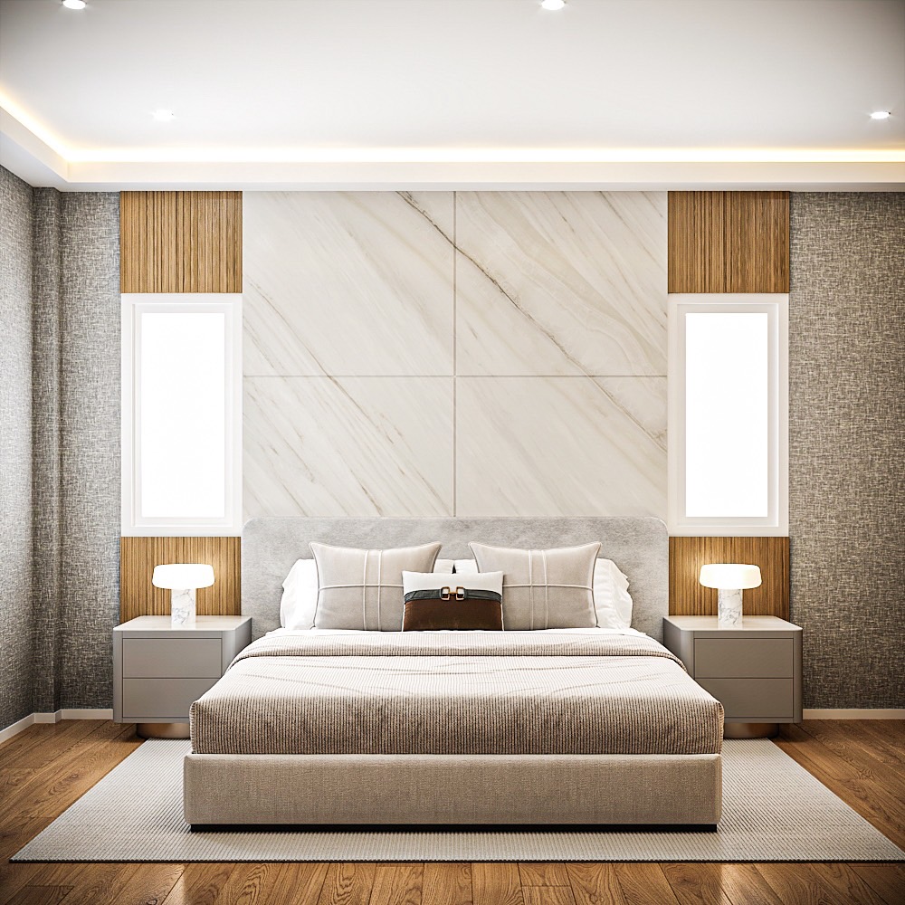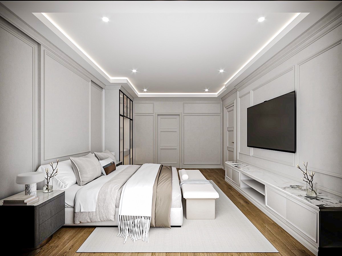 งานออกแบบตกแต่งภายในบ้านเดี่ยวในย่านกรุงเทพกรีฑา โดยใช้สไตล์ Modern Luxury เน้นความเรียบหรู ดูโปร่งโล่ง โทนสีขาว-เทา พร้อมเฟอร์นิเจอร์บิวท์อินและไฟซ่อน LED เพื่อความอบอุ่นและทันสมัยในเวลาเดียวกัน